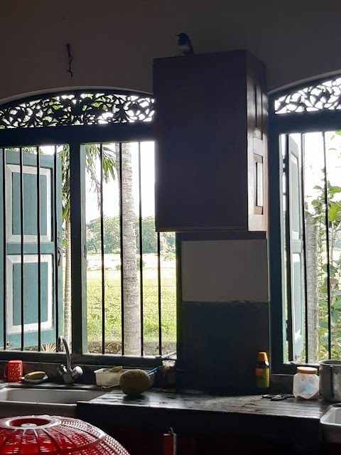 Polkichcha, the Oriental Magpie Robin, comes through the kitchen window bars quite often to feed on the scraps left in the clay pot. It is hesitant but knows the routine.